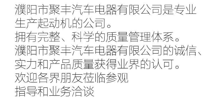 汽車起動機-減速起動機-起動機生產廠家-濮陽市聚豐汽車電器有限公司 版權所有 Copyright 2019 All Rights Reserved 聯系人:寧經理 聯系方式:0393-2272222 地址:河南省濮陽市臺前產業(yè)集聚區(qū) 備案號:豫ICP備11022272號-1 網站地圖 RSS